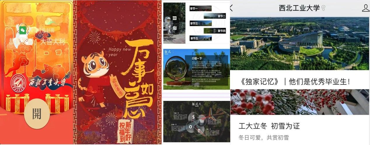 在任职党委宣传部融媒体办公室学生助管期间,余佳洁积极参与官方微信平台内容制作,出品数篇推文、西工大官方PPT模板、虎年微信红包定制封面等。发挥自身特长,为讲好工大故事尽一份绵薄之力;奉献自身热爱,在官微见证一批又一批工大学子从四面八方来,到五湖四海去。